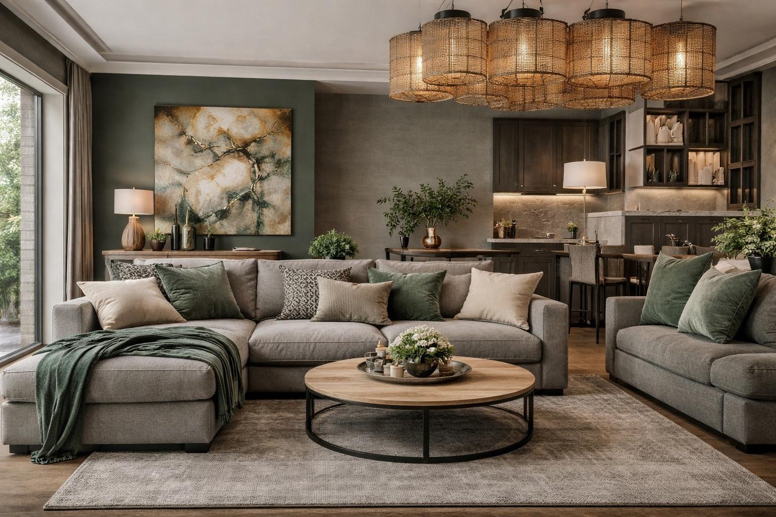Aménagement d'un salon haut de gamme avec matériaux nobles, éclairage architectural et finitions soignées.