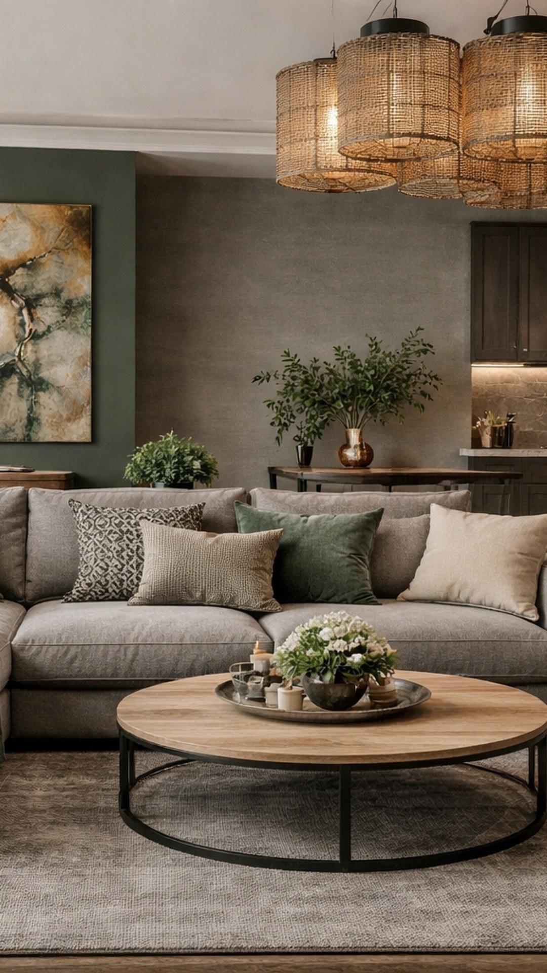 Aménagement d'un salon haut de gamme avec matériaux nobles, éclairage architectural et finitions soignées.